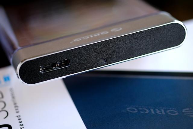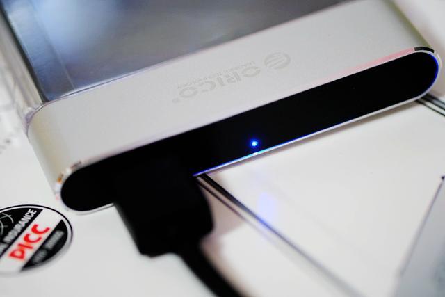 硬盘盒设有一个USB3.0接口和指示灯。接通电源后指示灯为蓝色,读写数据时则为蓝红闪烁,可以以此来判断当前硬盘的状态,它的传输速率最高可达5Gbps,兼容Windows、Mac、Linux等系统。