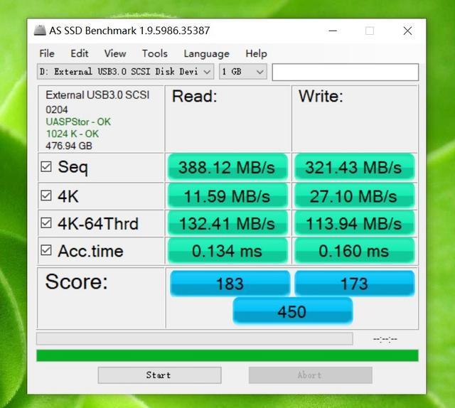 AS SSD Benchmark的测试结果,ORICO迅龙系列固态硬盘的最大读取速度达到了388.12MB/s,最大写入速度达到了321.43MB/s,读取写入速度值会比官方提供的数据低一些,但还是能令人满意。