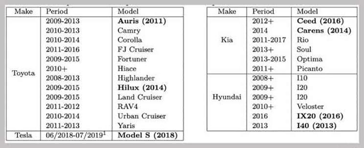 根据研究人员所提供的名单显示,有漏洞风险的汽车主要是2009-2017年的热销车型。研究人员认为,未在该名单内的汽车也可能会有同样问题。丰田已经证实,研究人员发现的漏洞确实存在,但是只有老车型才有这个问题。