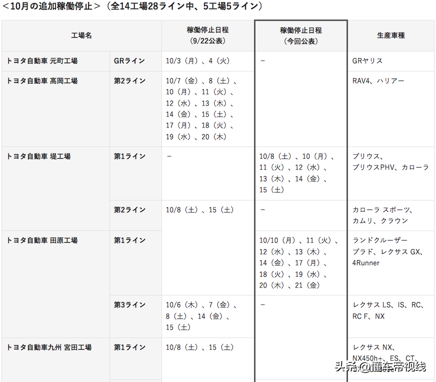 9月,丰田官方宣布,其10月在全球生产约80万辆汽车,较预定的月度目标减少约10万辆;10月,丰田汽车再宣布,其全球生产计划将由此前的80万辆下调至75万辆。
