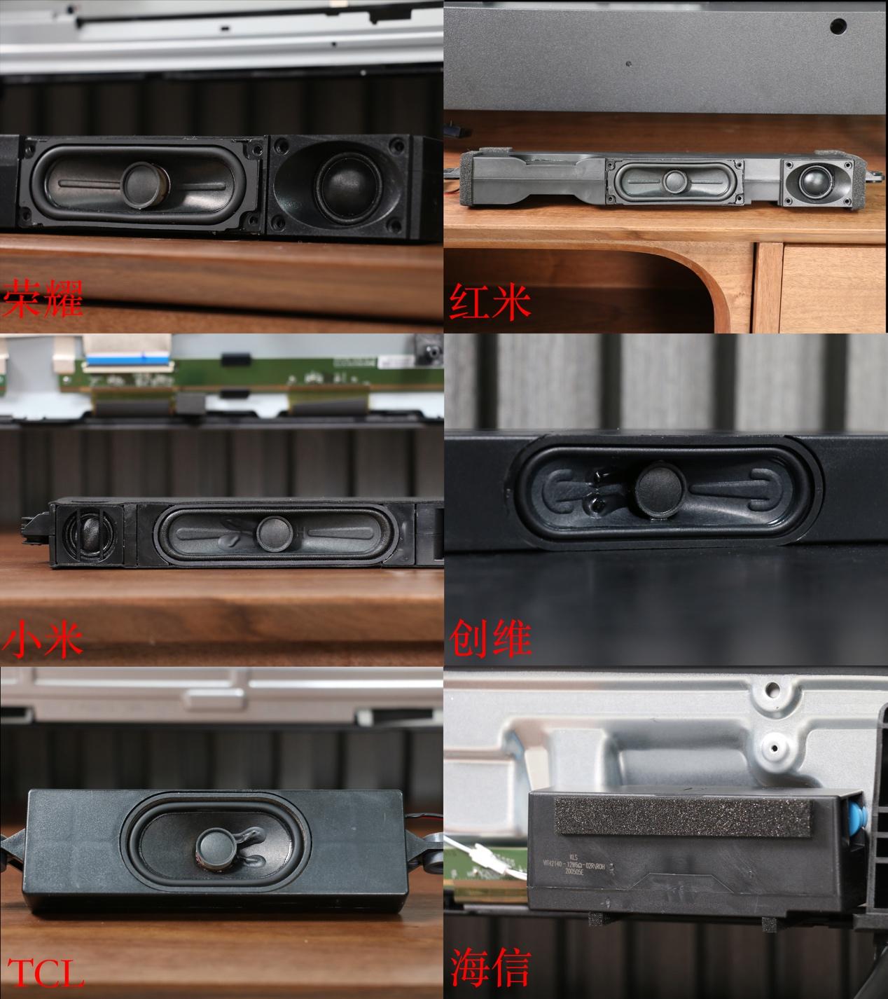 我们将六款产品的音响单元拆下后对比发现,Redmi X55在常规的全频扬声器和高频扬声器之外还增加了被动低频扬声器,而荣耀X1只有全频扬声器和高频扬声器,甚至尺寸都非常相近,猜测很有可能是采用的同一种声音解决方案。而其余几款产品的音响单元单从做工方面就知道差距已经产生,这也与最后的声音听感相对应。