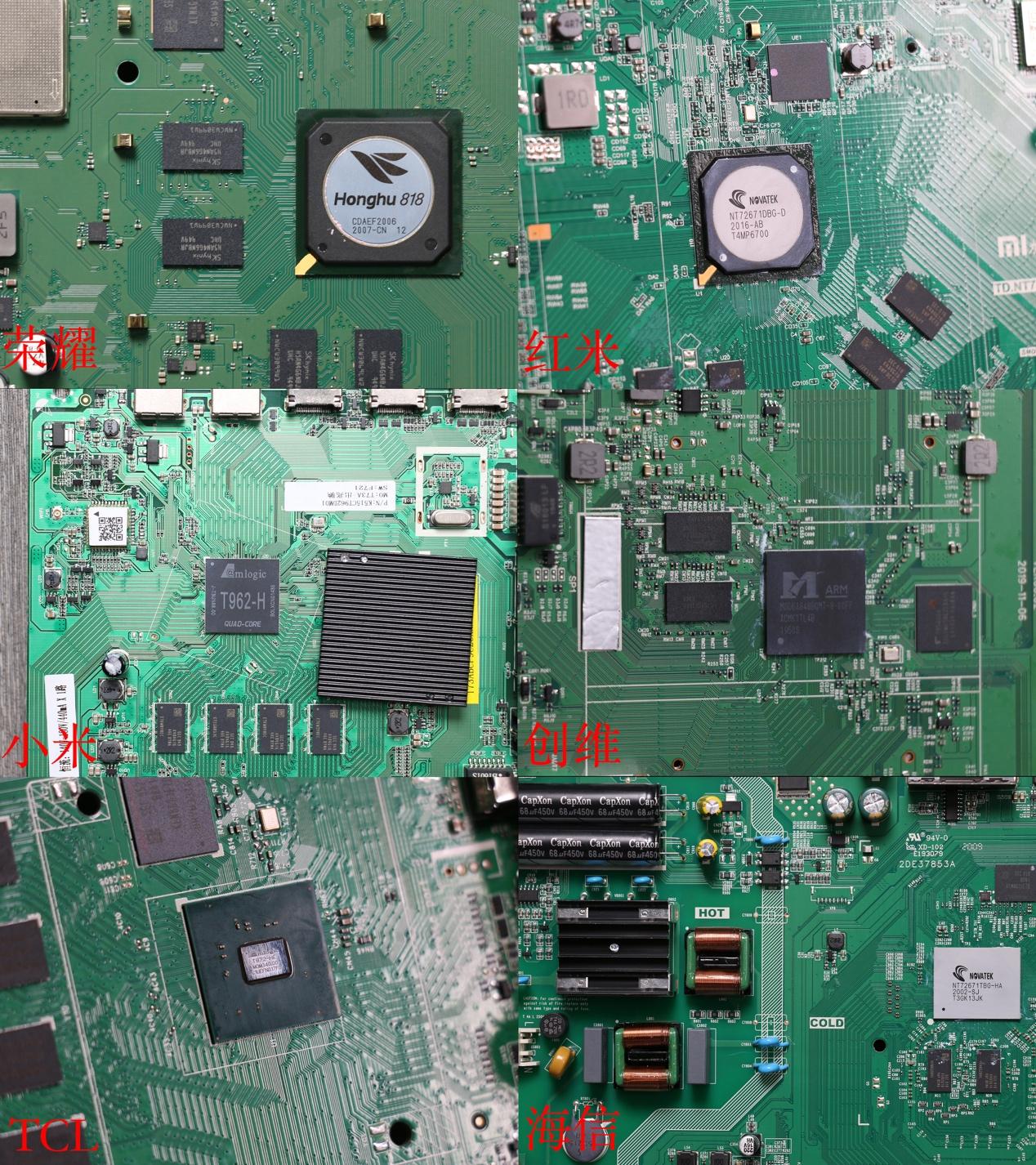 主电路板上放置的最引人关注的就是目前电视产品的心脏—芯片,我们本次测试的六款产品在芯片的选择上大致分为了四个阵营,荣耀X1采用的是自研的鸿鹄818芯片,Redmi和海信采用的是NOVATEK NT72671DBG-D,小米、TCL则采用的是Amlogic T962H和Amlogic T972-HE,最后的创维采用的则是晨星MSD6A848BQMT。