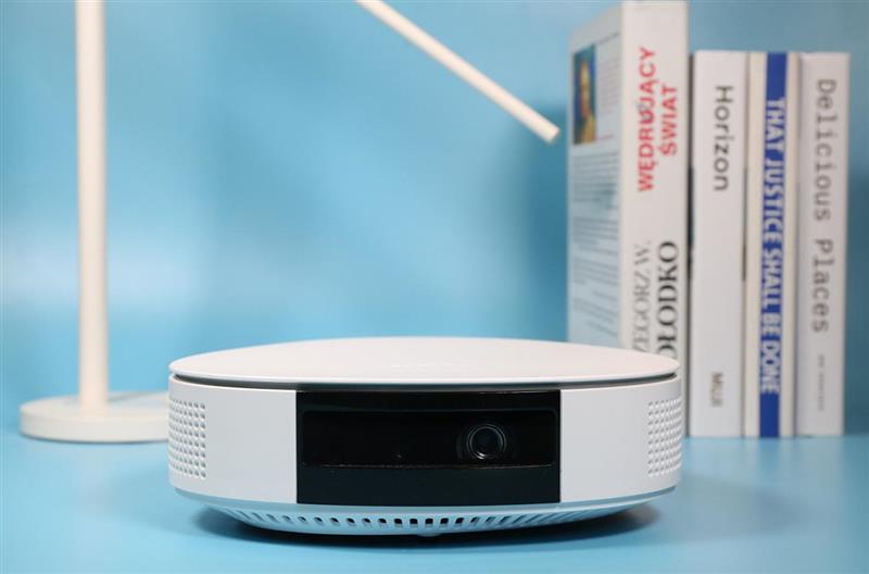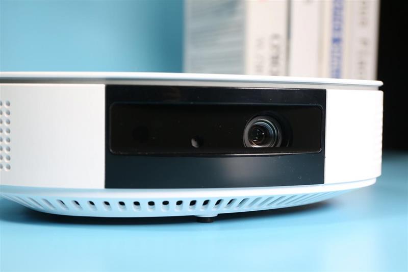 从这个角度可以看到散热孔分布在其左右机身两侧,在镜头处,当贝D1投影仪置放了一块黑色保护罩,保护镜头的同时亦作装饰之用。