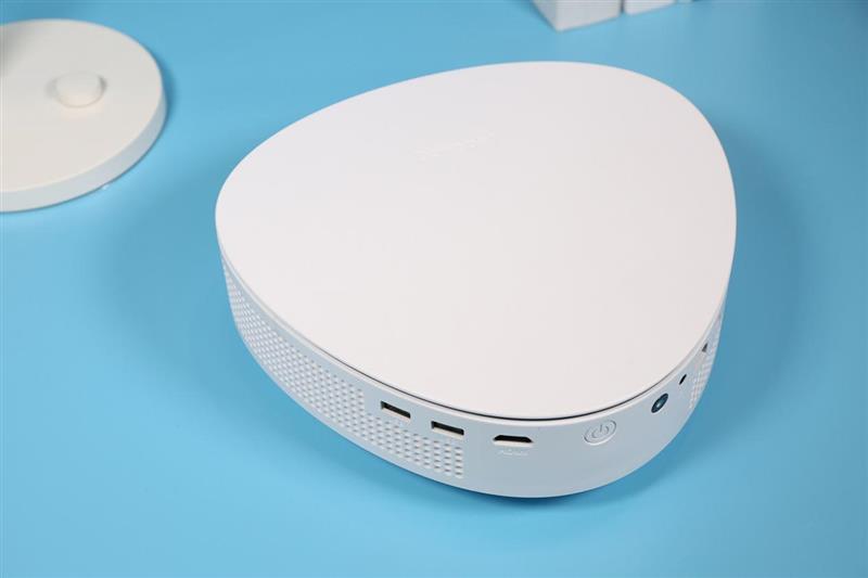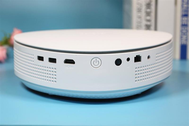 来看当贝投影D1的接口状况,可以看到其机身标配两个USB 2.0接口,一个HDMI接口、一个3.5㎜耳机孔、一个网线接口,还有一个电源接口,单个类型的接口数量不是太多,但重在类型齐全,可以胜任多种场景的使用。