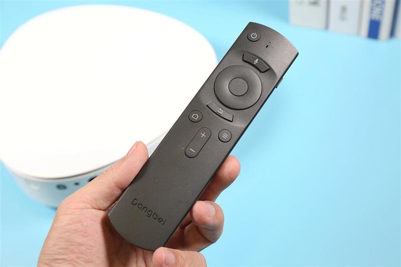 这是当贝投影D1的语音遥控器,通过蓝牙连接设备,并且其会附赠两节7号电池,拿来就可以直接使用。并且还延续了当贝投影F1的侧边键和home键功能,长按侧边键可以实现自动对焦,短按侧边键能快速调出常用设置功能。长按home键,可以调出后台运行程序,并一键清理,让投影更加顺畅。