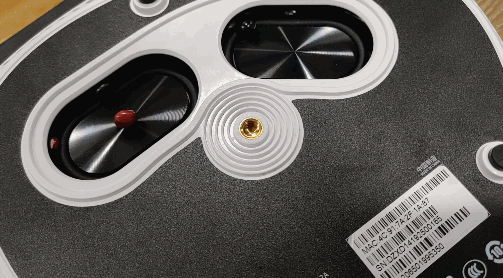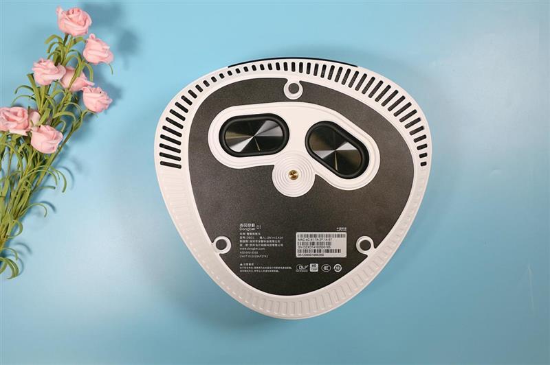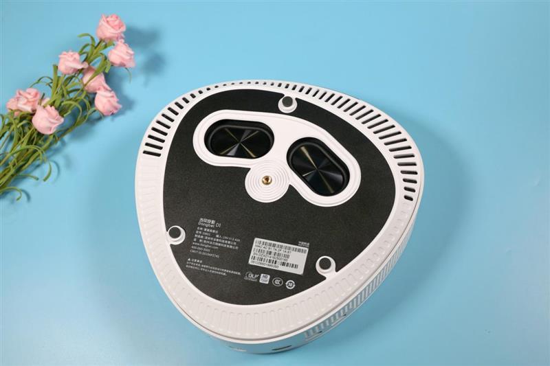 来看当贝投影D1的背面,可以看到三个角各自放置一个防滑脚垫,还有两个直径45㎜的喇叭的对称低音振膜引人注目,据悉其声压等级最高可达90dB,我们会在接下来进行进一步的深度体验测试。作为长时间于一处静态放置的设备,笔者觉得有必要为喇叭做好防尘工作。