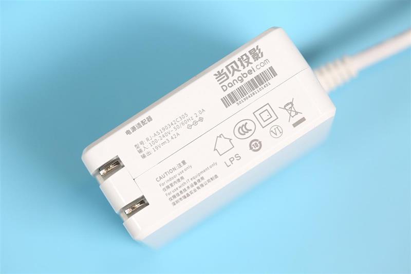 这是当贝投影D1的电源适配器,采用扁平风设计,小身板很容易在插线板和墙插之中自由穿梭,不需要占用太大空间。