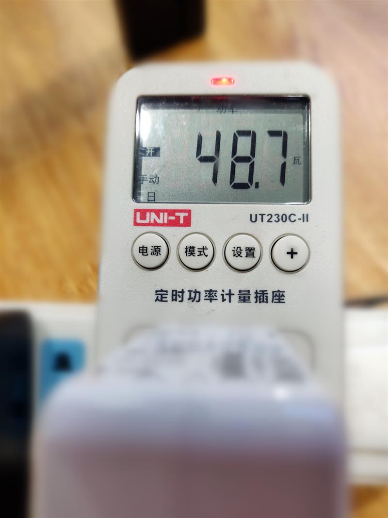 通过测试仪器测得了当贝投影D1在正常工作播放影视剧的功率在48.7W左右。在关掉光机用作蓝牙音箱后,功率瞬间降为7.4W。
