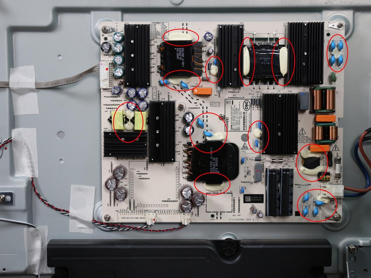 几款产品中,荣耀X1的点胶量无疑是最大的,肉眼可见的范围内都是白色的绝缘胶以及在触点上的蓝色点胶。其余几款产品中,Redmi X55的点胶量相对来说也比较多,但是和荣耀X1相比就有些小巫见大巫了,而小米、创维、TCL、海信这些品牌仅仅在触点上有蓝色点胶,在元件之间并未点胶,相对来说被外力冲击和被电流击穿的概率就要大很多。
