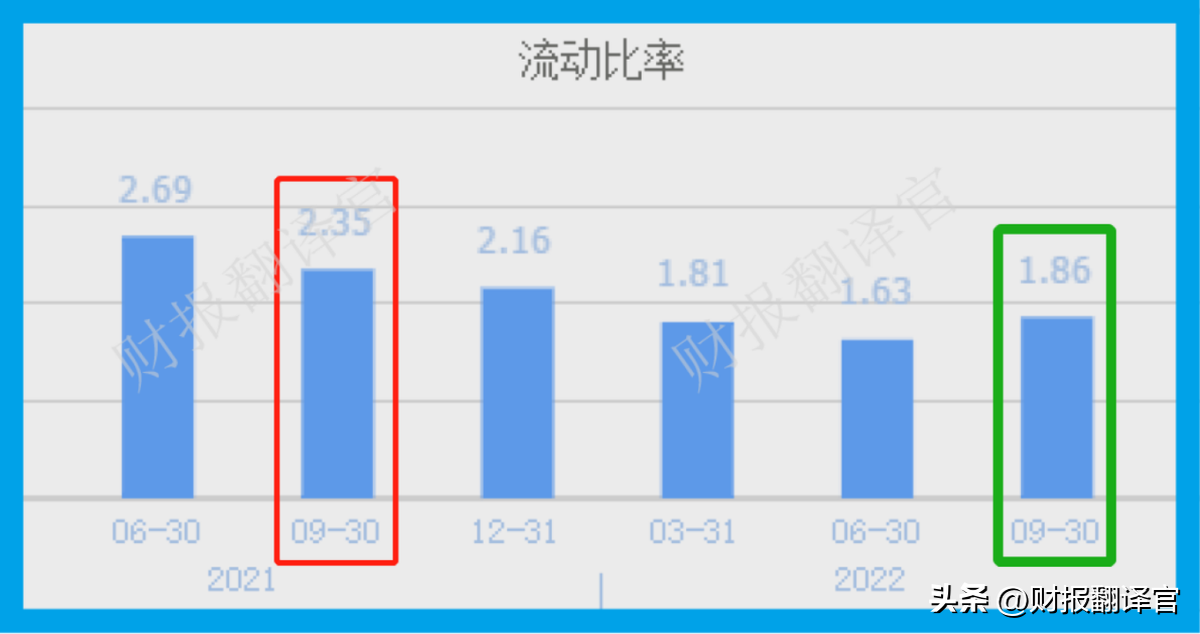 如果发生任何意外,管理层可以把流动资产变现来偿还短期的债务。而到了2022年第三季度,该企业的流动比率就降至1.86,同比下滑了21%。