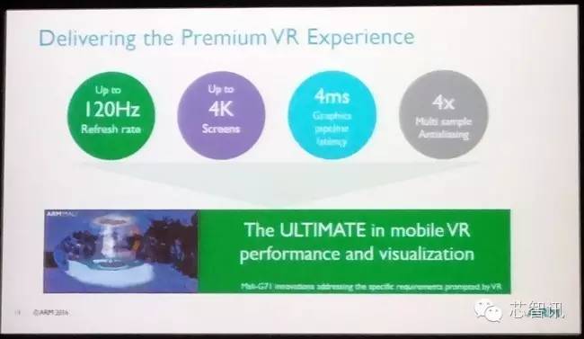 ARM认为高端VR用户体验关键指标在 :1、图像刷新率要达到120Hz;2、屏幕分辨率达到4K; 3、图形处理的延时小于4ms ;4、多采样抗锯齿性能要在现有基础上提升4倍。这对于CPU和GPU性能提出了更高的要求。