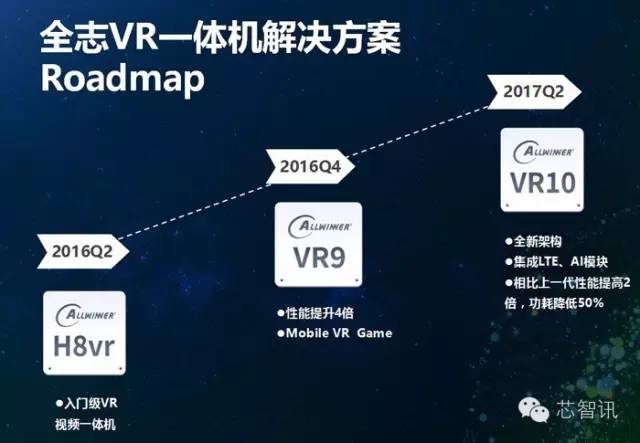 接下来全志将会在今年四季度针对移动VR游戏市场推出全新的VR9,其性能将会提升四倍。另外在明年二季度,全志还将推出采用全新架构(可能是ARM最新推出的A73架构呢),集成LTE、AI模块的VR10,其性能相比VR9将提升2倍,同时功耗将降低50%。