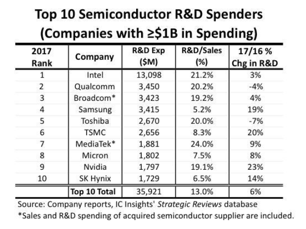 所以说半导体行业是最烧钱的行业,华为海思从04年到现在投入1000多亿,才取得一些成果,就可见一斑!阿里的达摩院三年投入1000亿。可以看一下,2017年半导体厂商研发投入,最低的都是百亿人民币起步!对于半导体行业大厂而言,砸个千亿投入都是非常正常的!