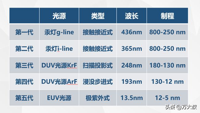 首先大家要明白一个概念,严格地说并没有所谓的几纳米几纳米光刻机,这种说法一般来说只是代表这种光刻机可以实现几纳米工艺。其实中高端光刻机主要分2种,DUV光刻机和EUV光刻机。