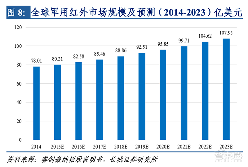 在军用红外市场,据Maxtech International及北京欧立信咨询中心预测,2023年全球军用红外市场规模将达到107.95亿美元(约764.43亿人民币),虽主要以欧美发达国家占据主要地位,但我国军队红外热像仪配备相对较少,随着国家积极推进军队信息化和武器装备的现代化建设,包括单兵、坦克装甲车辆、舰船和红外制导武器等红外装备市场也将迎来快速发展阶段。