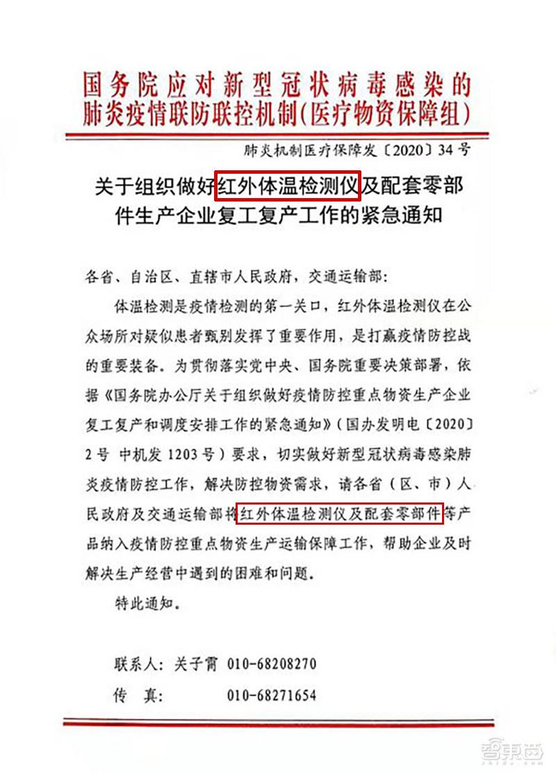 紧接着1月30日,国务院相关医疗物资保障组发布《关于组织做好疫情防控重点物资生产企业复工复产和调度安排工作的紧急通知》,将红外体温检测仪及配套零部件等产品纳入防疫重点物资,保障生产和输送的有序进行。