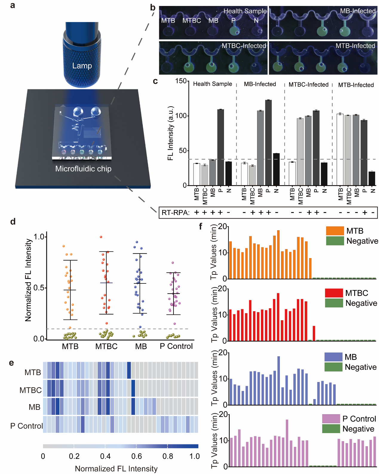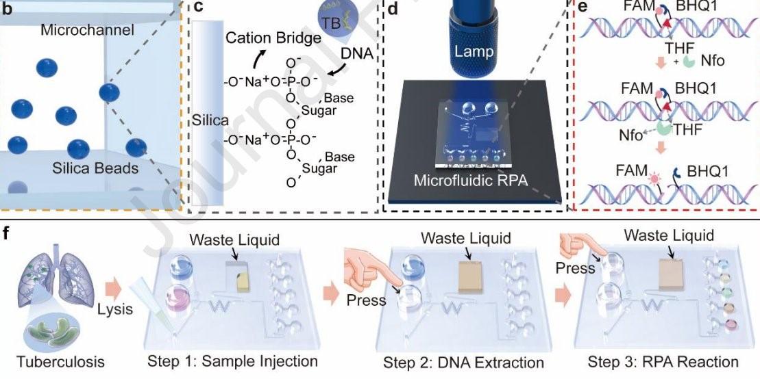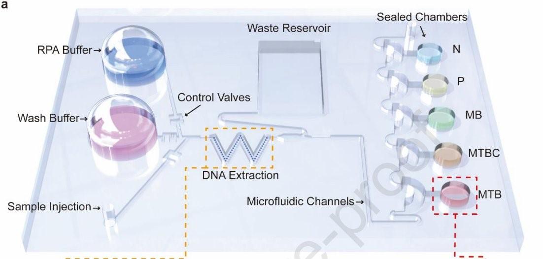 总的来说,Fd-MC能够实现芯片上的“样本输入和结果输出”,集成了包括从结核病病原体中提取DNA、基于RPA(重组酶聚合酶扩增)的荧光可视化的多个操作步骤。
