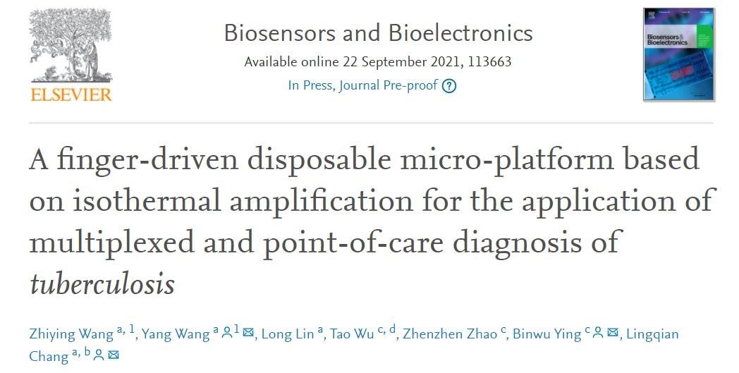 日前,相关论文已由合作双方发在Biosensors &Bioelectrnics(IF: 10.6)上,论文题为 《基于等温扩增的手指驱动一次性微平台在结核病多点诊断中的应用》(A finger-driven disposable micro-platform based on isothermal amplification for the application of multiplexed and point-of-care diagnosis of tuberculosis) 。第一作者是北航博士生王之莹,共同通讯作者分别是北航常凌乾教授、以及华西医院检验科主任应斌武教授。