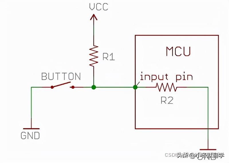 一般规则是使用 比输入引脚的输入阻抗(R2)小一个数量级(1/10) 的上拉电阻(R1),小10倍的电阻值。