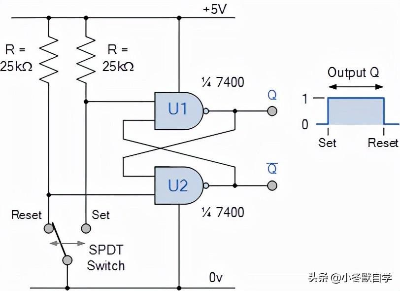 两个 TTL 74LS00 NAND 门以及一个单刀双掷开关将用于制造简单的 Set-Rest 双稳态触发器。计算:1).如果表示逻辑HIGH输入的电压在开关打开时保持在4.5伏,则最大上拉电阻值;2).开关关闭时流经电阻的电流(假设接触电阻为零)。同时绘制电路。