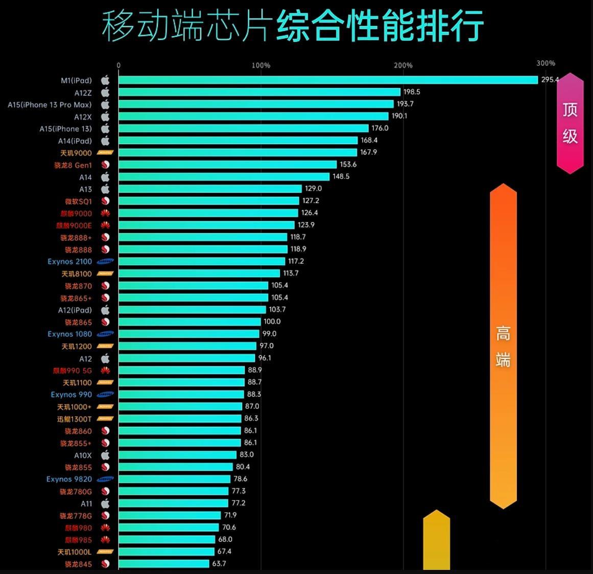 从这个榜单来看,苹果真的是当之无愧的王者,最牛的是M1芯片,再是A12Z、A15(满血版),A12X、A15(减配版)、A14(iPad版本)、天玑9000、高通骁龙8Gen1、A14、A13……,具体的排名大家仔细看。