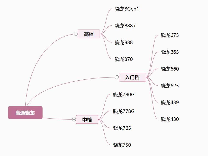 先说高通的, 高通其实有很多系列,但都可以用高、中档、低档来划分,其代号也主要用8、7、6这样来命名,具体一些常见芯片的分类,及档次如上图。