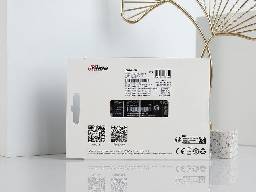 包装盒背面设计了一个小窗口,透过它可以看到里面的SSD本体。此外,包装盒背面标注了一些产品信息。笔者手中这款SSD的出厂日期为2023年1月份,很新。售后方面,大华存储承诺为这款SSD提供十年有限质保,纵观SSD市场,十年有限质保算是时间较长的质保服务了。