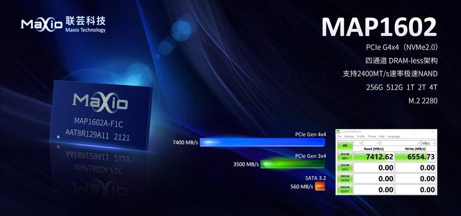 MAP1602是联芸科技推出的第三代PCIe(NVMe)主控芯片,采用全球领先的12nm工艺技术设计,支持PCIe Gen4x4 NVMe 2.0 接口技术标准,采用ARM R5高性能CPU内核 ,内嵌联芸自主研发的第三代Aglie ECC(4K LDPC)纠错技术、Agile Zip数据压缩技术、硬件RAID5/6 及E2E 数据保护技术并搭载联芸科技全新的超低功耗SoC芯片架构设计技术与NAND接口高性能自适配技术(无需超频即可达到2400MT/s),至高可支持高达7400MB/s的顺序读取性能,容量至高可支持到4TB。