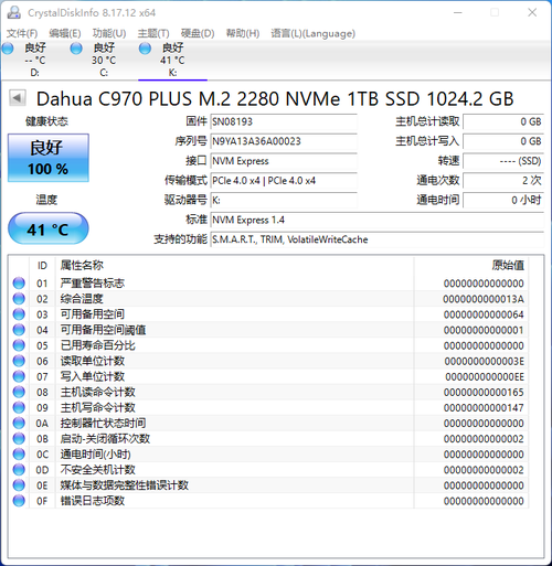 大华存储的C970 PLUS系列PCIe4.0固态硬盘 1TB的CrystalDiskInfo信息。开机运行后,这款SSD的实际容量约为954GB。