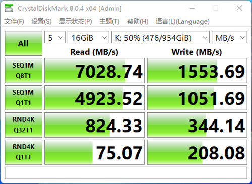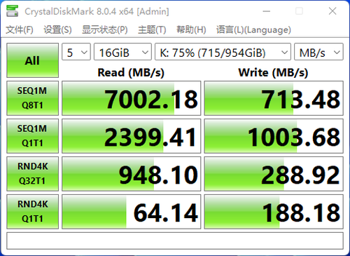 此时,这款SSD的写入性能会大幅下降。CrystalDiskMark测出的连续写入性能至高只有1500多MB/s。50%空间占用率下,这款SSD的读取性能依旧不错,超高7000MB/s。