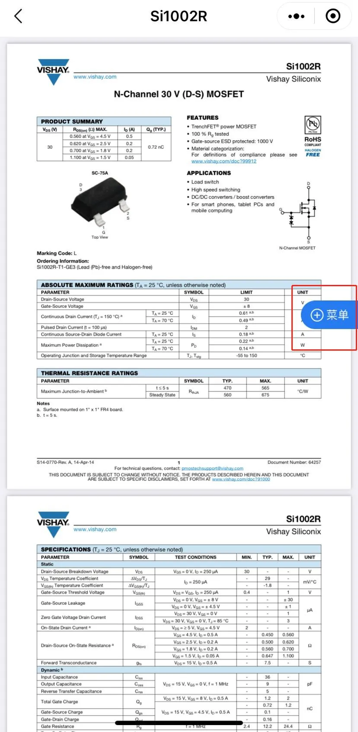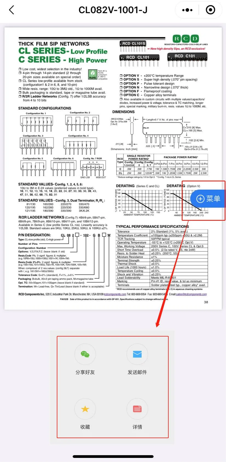 ☆进入规格书浏览页面,点击“菜单”,即可对规格书进行收藏、分享、邮件发送等操作。除了在“菜单”里选择分享,也可以直接点击右上角的三个点进行分享。