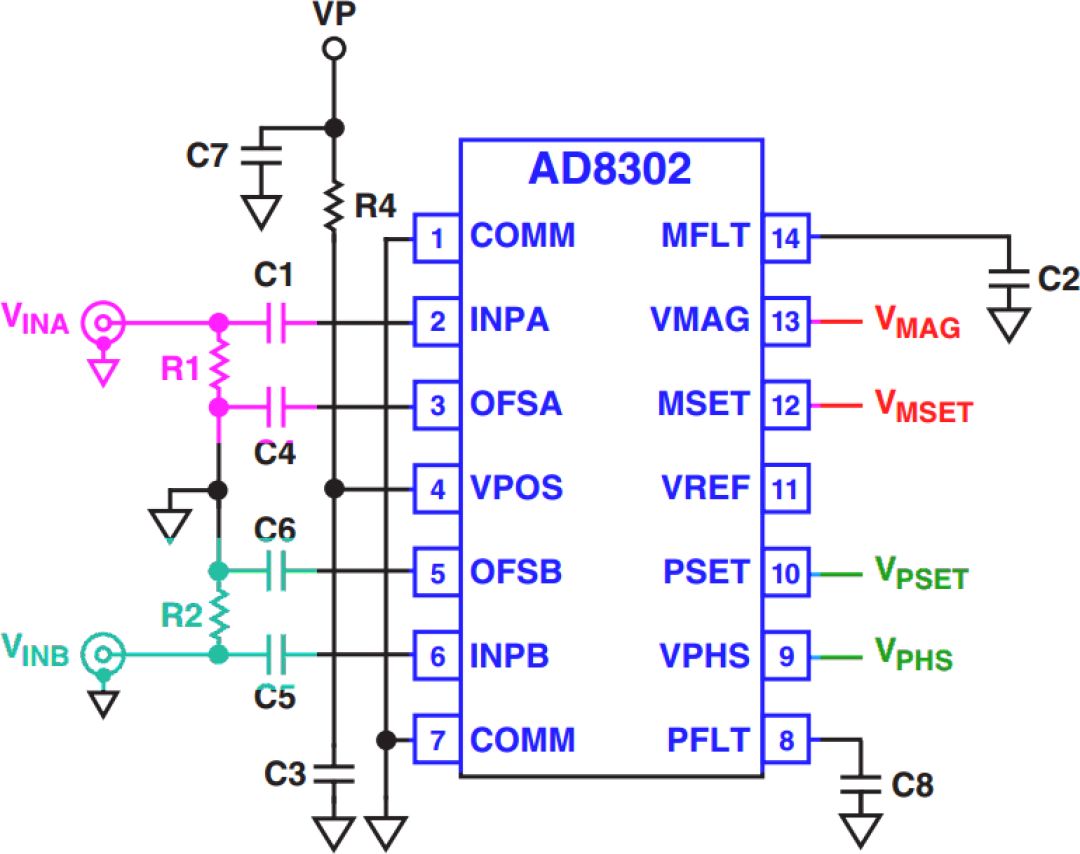 AD8302通过Vina, Vinb输入两个测量信号。通过VMAG和VPHS两个管脚输出两个信号功率之比的分贝值,以及它们之间的相位差。