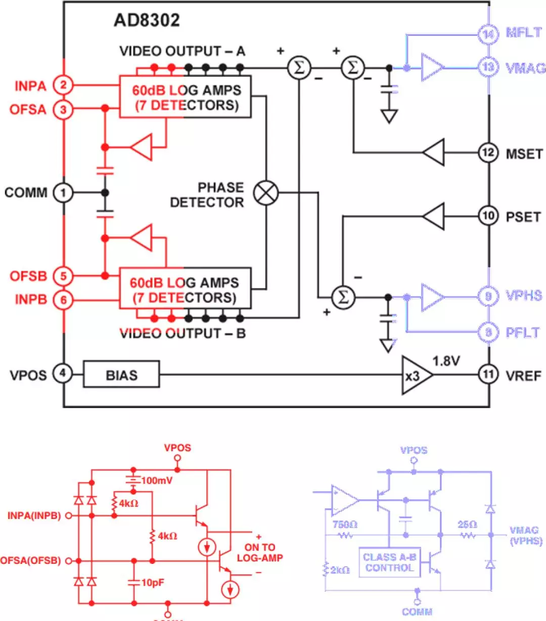 AD8302主要由精密匹配的两个宽带对数检波器、一个相位检波器、输出放大器组、一个偏置单元和一个输出参考电压缓冲器等部分组成,能同时测量从低频到2.7GHz频率范围内的两输入信号之间的幅度比和相位差,可应用于RF/IF功率放大器线性比的测量、RF功率的精确控制、驻波比测量及远程系统的监视和诊断等。