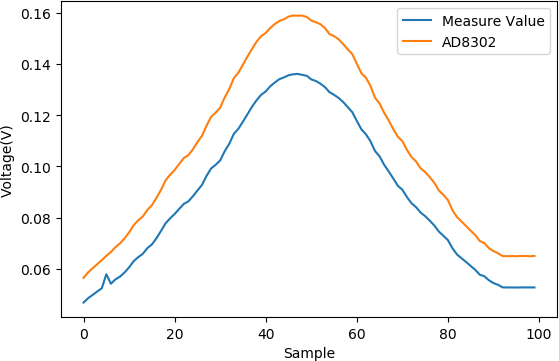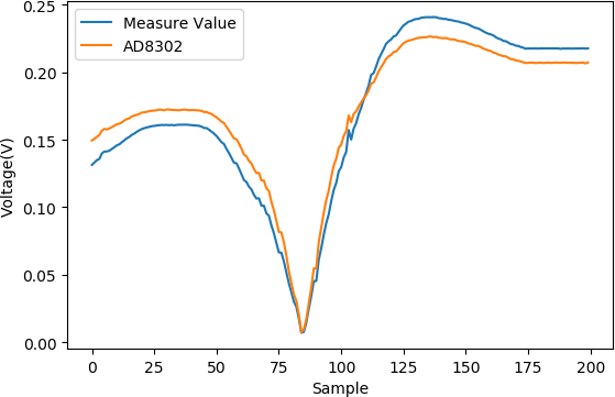 当输入信号有效值小于0.2V的时候,AD8302输出值经过取指数运算换算成电压信号有很好的线性,当输入信号超过0.2V时,AD8302输出逐渐饱和了。