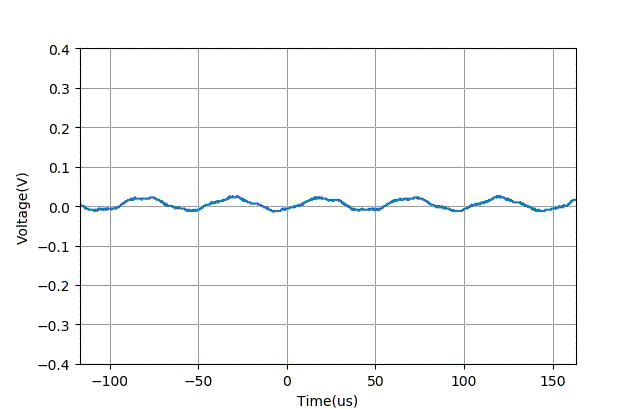 在上述实验中,AD8302输入信号分别来自于两个频率源。虽然它们都设置为20kHz,但之间并没有严格同步。所以AD8302的相位出现变化,反映了这两个信号之间些许的频率差别。