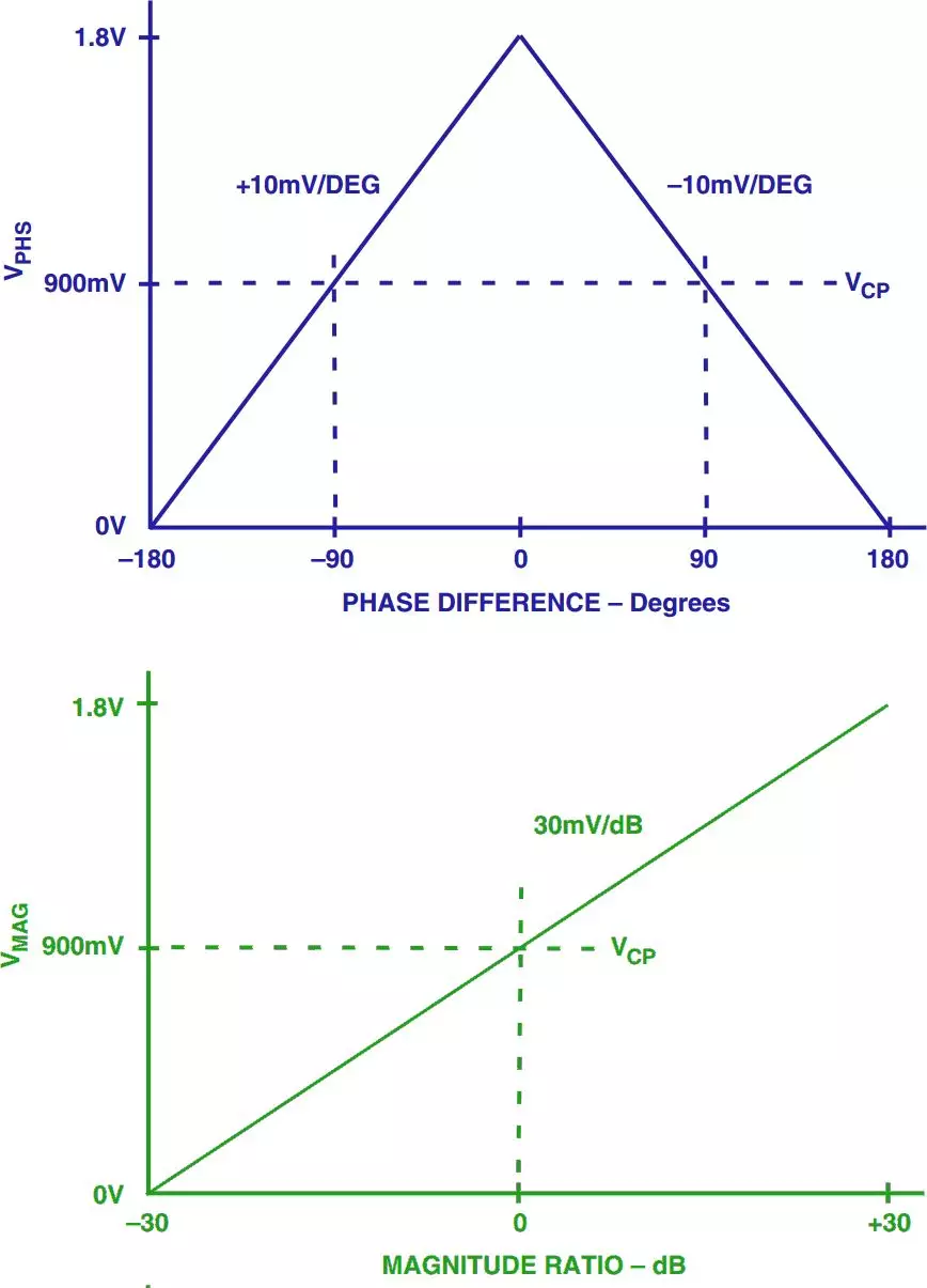 两个信号Vina, Vinb功率分贝值之差从管脚VMAG输出,单位是每dB30mV。从0至1800mV可以表示60dB(100万倍)功率差别,从电压幅值是1000倍的差别。