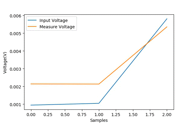 将AD8302输出信号通过取指数运算,重新转换成实际电压信号。下图显示了AD8302输出值对应的电压信号(黄线)与实际输入信号(蓝线)之间的对比。