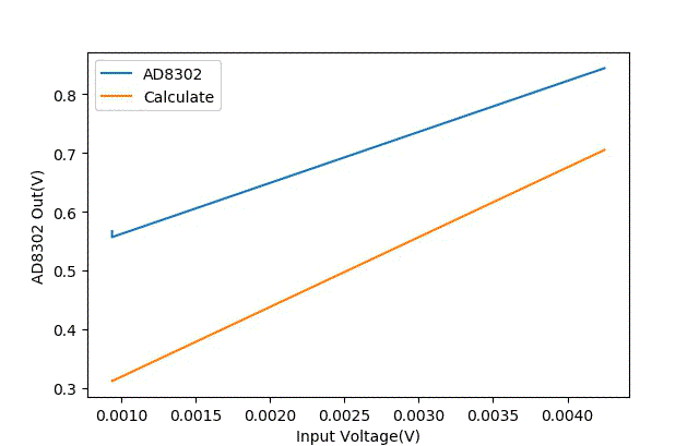 由于输入信号幅值超过0dBm(0.223V),AD8302输出值比计算值偏低,呈现饱和状态。