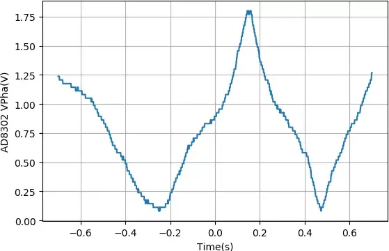 下图显示了垂直于地面的电感传感器,从左到右横扫20kHz电磁导线所感应出的高频信号,对应AD8302的幅值和相位输出信号。