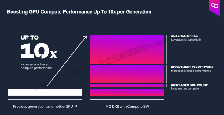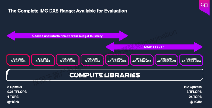 并且Imagination DXS GPU IP,峰值性能比Imagination上一代汽车GPU提高了50%,可扩展至192 GPixel/s、6 TFLOPS和 24 TOPS,AI性能更是有高达10倍的提升。