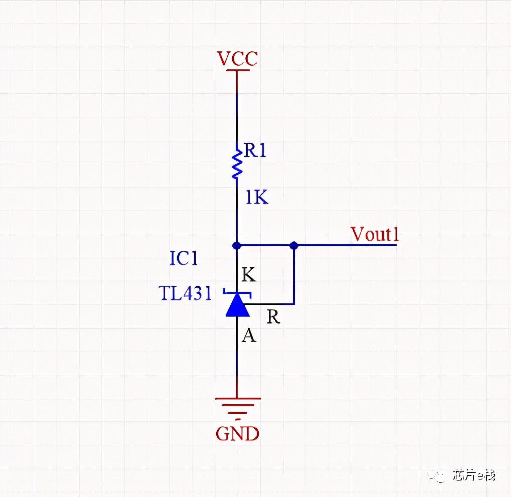 TL431因为其钳位特性,即输入电压范围在2.5V-36V内,都总能输出恒定的Vref幅值的基准信号(2.5V-36V可调输出),故常用于作为ADC的基准源,以及DCDC芯片的基准源,它的其中一个常用电路如图: