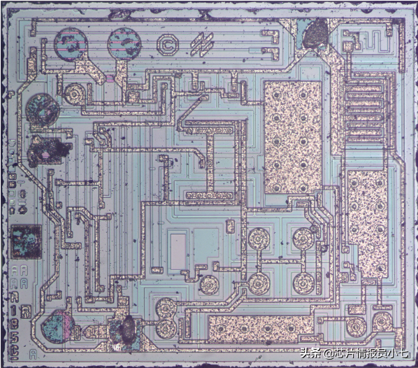 输出晶体管(下图)比其他晶体管大得多,并且具有不同的结构,以支持芯片的大电流输出。它有多个用于发射极和基极的互锁“指”,被大集电极包围。
