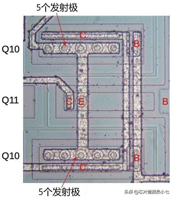 晶体管 Q10 和 Q11 是带隙基准的关键,Q10 有 10 个发射极,因此每个发射极的电流是 Q11 的 1/10。