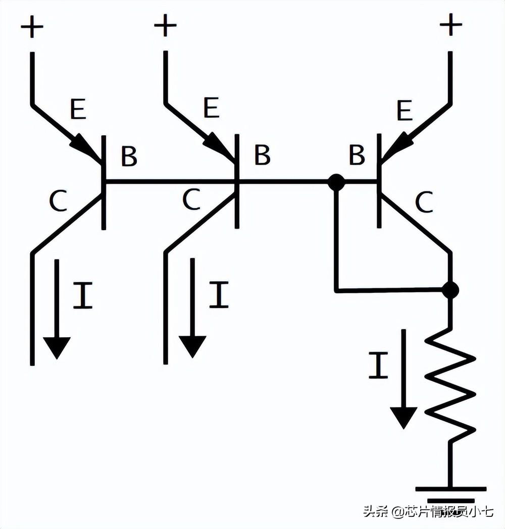 参考电流通过右侧的晶体管。(在这种情况下,电流由电阻器设置。)由于所有晶体管具有相同的发射极电压和基极电压,因此它们提供相同的电流,因此左侧的电流与参考电流相匹配。