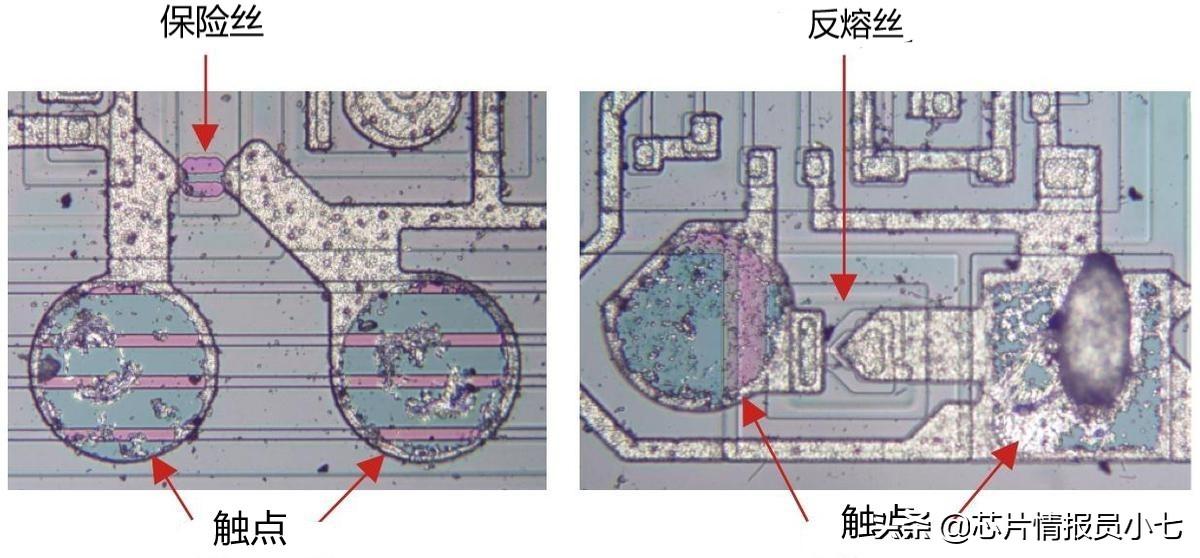 反熔丝可以由齐纳二极管构成,将其短路的过程称为“齐纳击穿”。高电流通过结形成金属尖峰,使其永久导电。下图显示了出现在裸片上的保险丝和反保险丝。