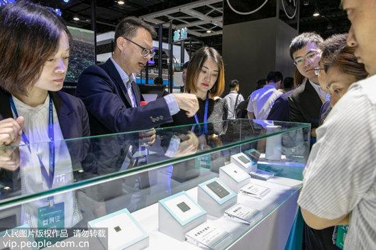 2019年5月31日,辽宁省沈阳市新世界博览馆,参展人员介绍华为芯片。