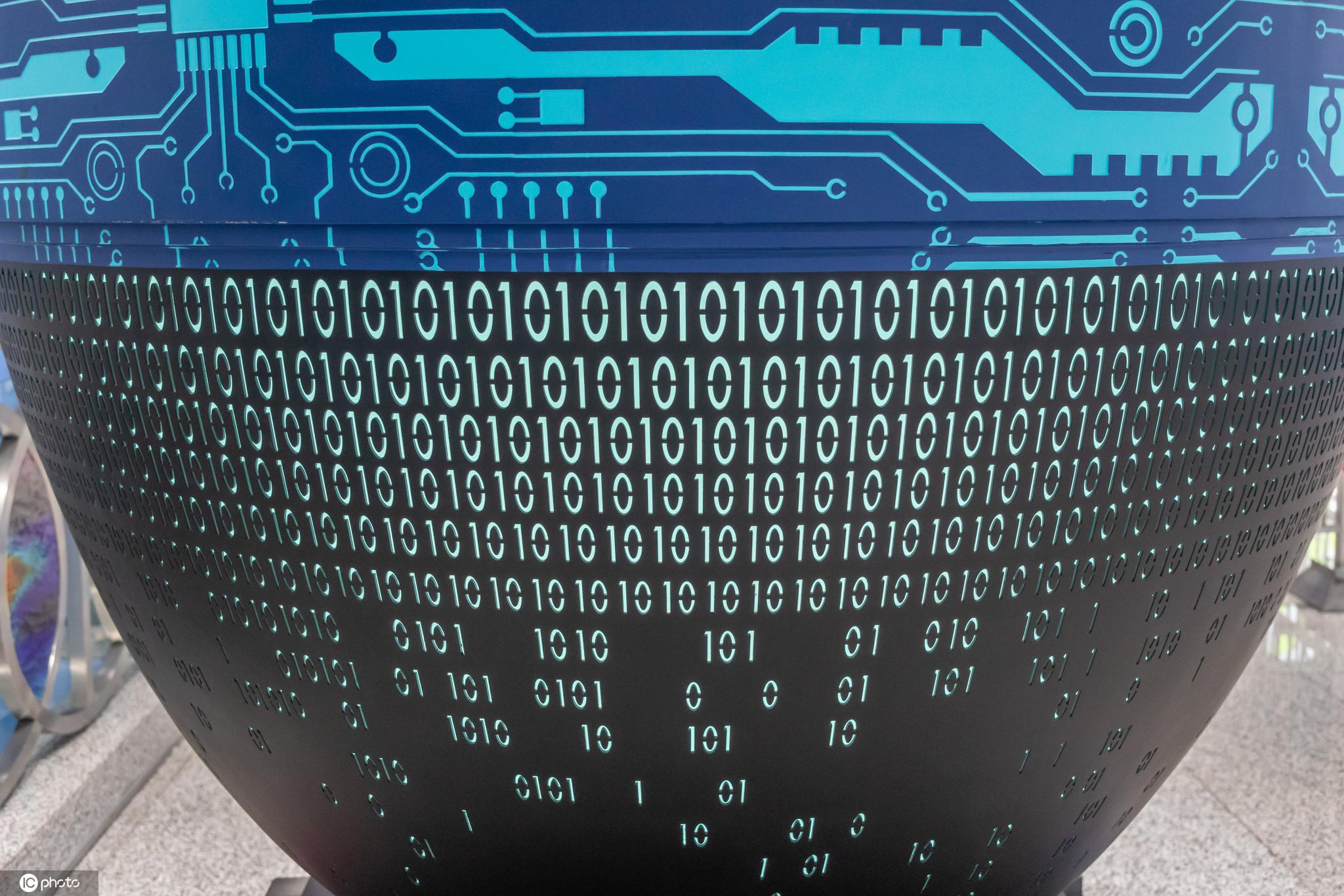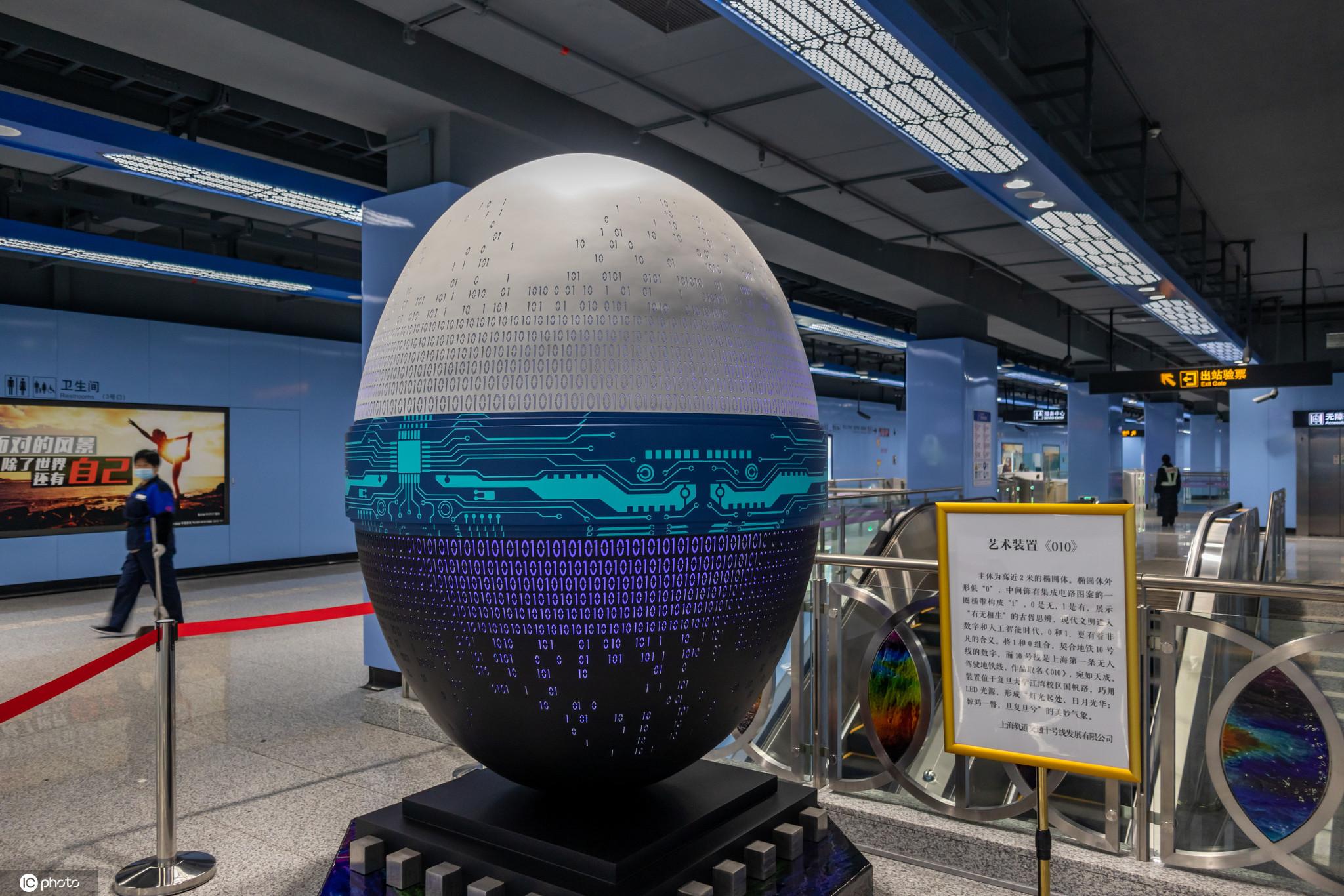 上海,地铁10号线国帆路站内,一只高度近2米的椭圆体颇为醒目。这件艺术装置名为《010》,中间饰有集成电路的图案,上下方的LED灯光变幻出不同色彩的数字0和1。