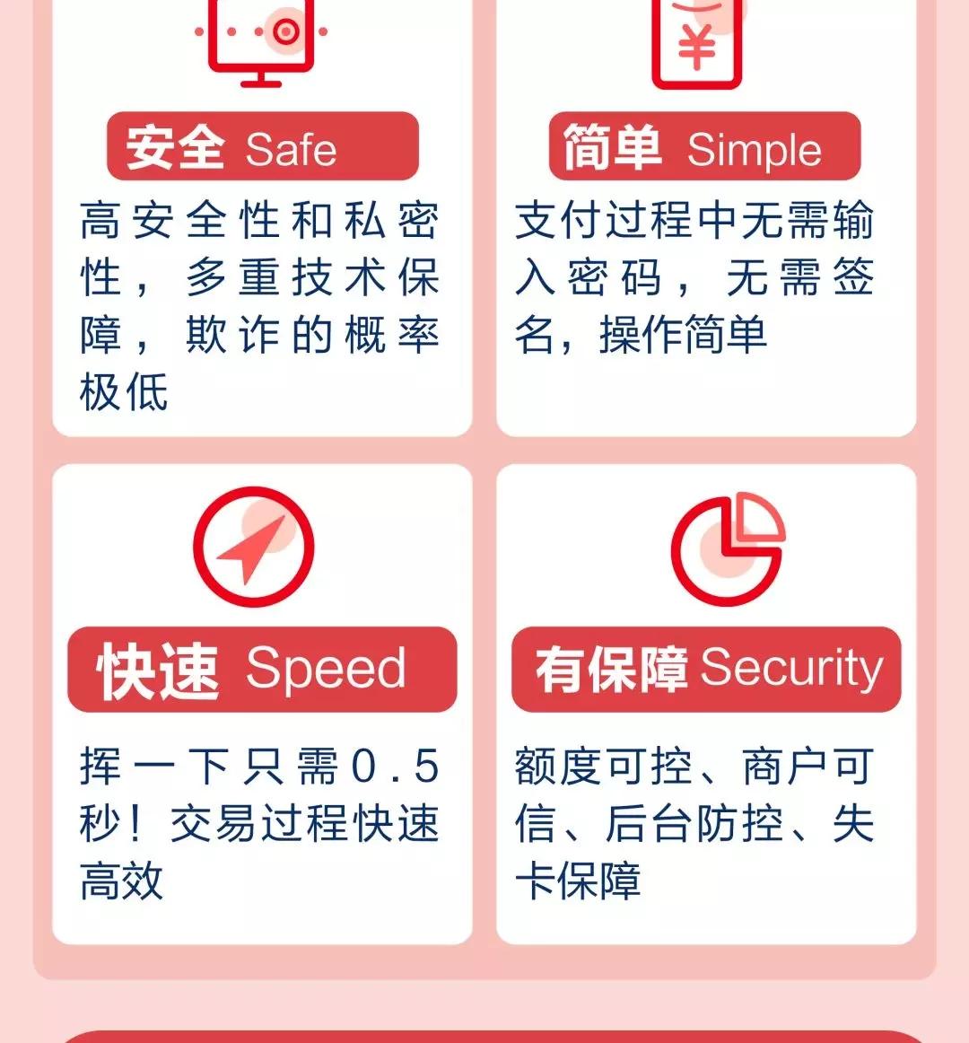 而基于IC卡技术,诞生了无需密码无需签名的小额免密免签服务,也就是通常所说的“闪付双免”,在指定商户进行一定金额(境内1000元人民币,境外以当地限额为准)及以下的交易时,只需将卡片或移动设备靠近POS机等受理终端的“闪付”感应区,即可完成支付。
