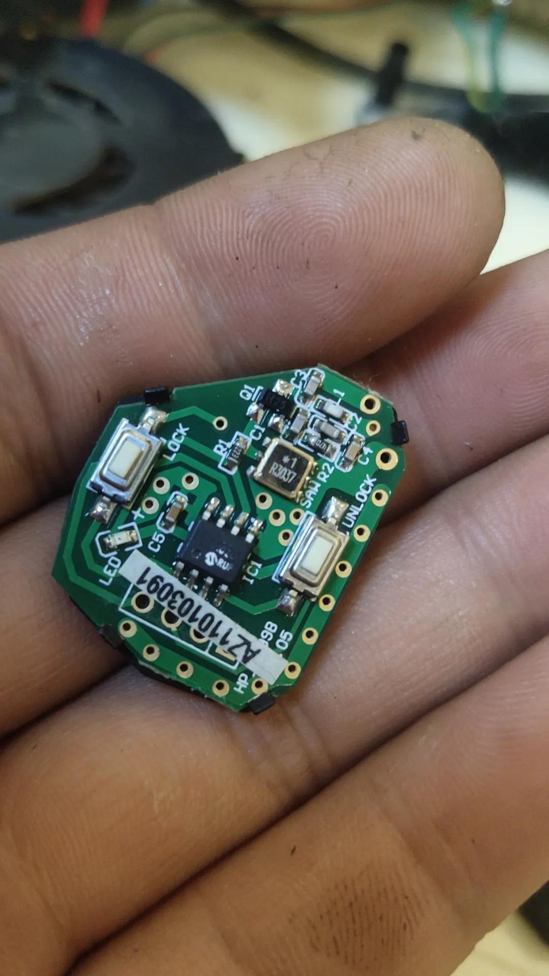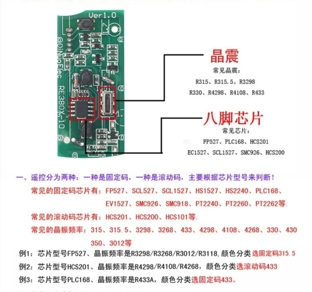 这个是拆开后的样子,要看你主板上有没有长方形或正方形晶振,记下上面的数字,然后再看有没有那个八角芯片,看这2个东西是为了查看钥匙主板是-滚码-或是-固定码,这个图可对比一下看看你的是哪一种
