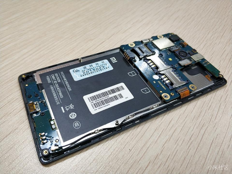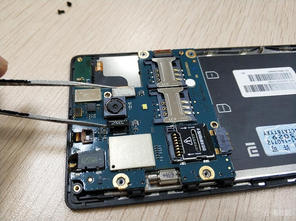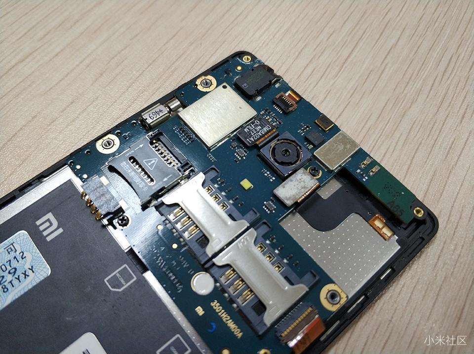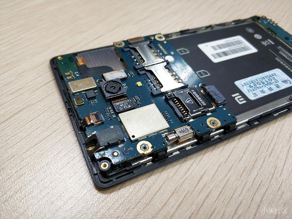 红米1S手机在主板设计上,主要集中在机身上方,很直观可以看到双SIM卡槽,TF卡槽和后置摄像头,把周围的排线和螺丝拧开之后,就可以取出主板了。